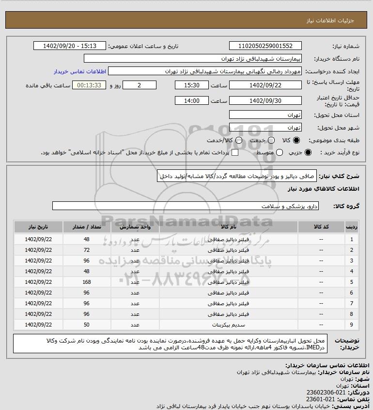 شرح کلی نیاز: صافی دیالیز و پودر توضیحات مطالعه گردد/کالا مشابه/تولید داخل