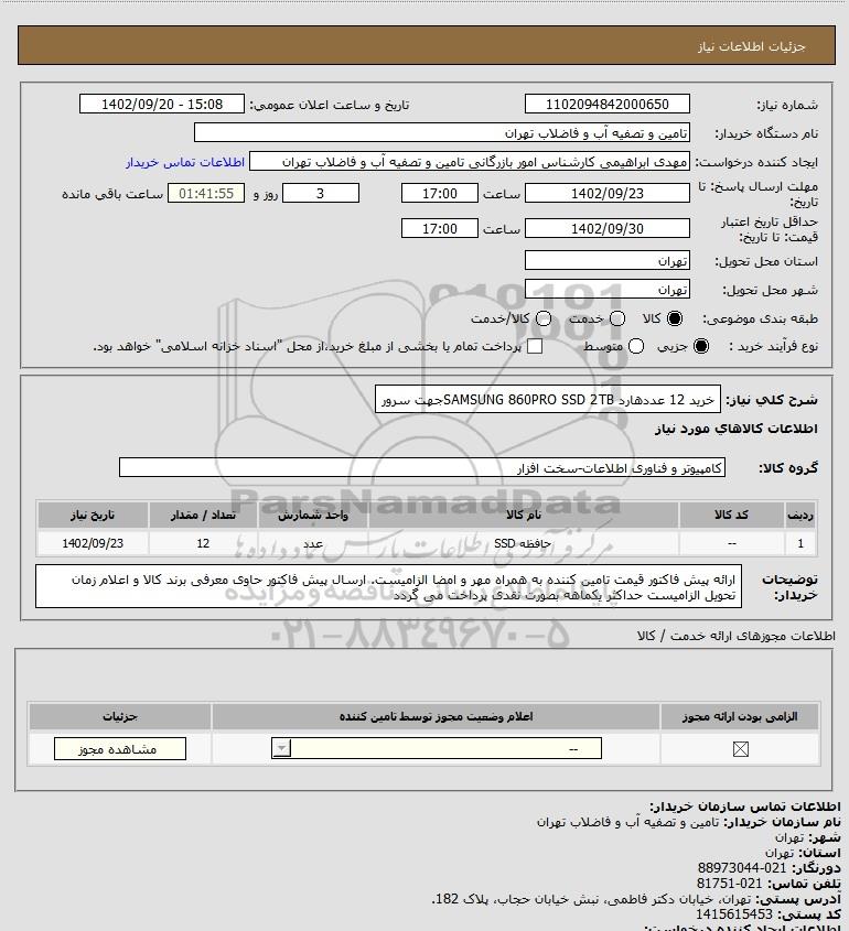 نام دستگاه خریدار:تامین و تصفیه آب و فاضلاب تهران