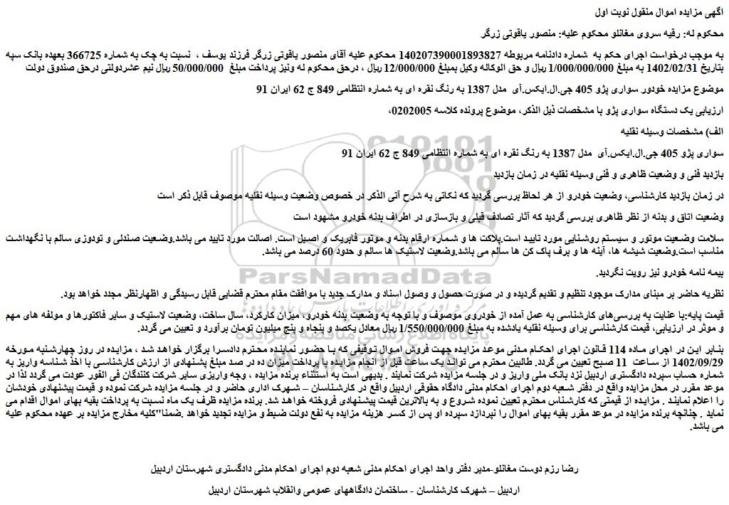 موضوع مزایده خودور سواری پژو 405 جی.ال.ایکس.آی  مدل 1387 به رنگ نقره ای به شماره انتظامی 849 ج 62 ایران 91