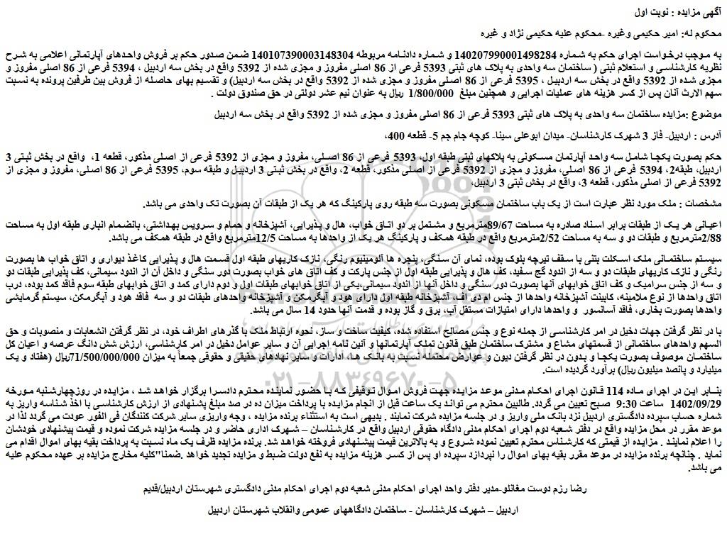 به موجب درخواست اجرای حکم به شماره 140207990001498284 و شماره دادنامه مربوطه 140107390003148304 ضمن صدور حکم بر فروش واحدهای آپارتمانی اعلامی به شرح نظریه کارشناسی و استعلام ثبتی ( ساختمان سه واحدی به پلاک های ثبتی 5393 فرعی از 86 اصلی مفروز و مجزی شده از 5392 واقع در بخش سه اردبیل ، 5394 فرعی از 86 اصلی مفروز و مجزی شده از 5392 واقع در بخش سه اردبیل ، 5395 فرعی از 86 اصلی مفروز و مجزی شده از 5392 واقع در بخش سه اردبیل) و تقسیم بهای حاصله از فروش بین طرفین پرونده به نسبت سهم الارث آنان پس از کسر هزینه های عملیات اجرایی و همچنین مبلغ 1/800/000 ریال به عنوان نیم عشر دولتی در حق صندوق دولت .