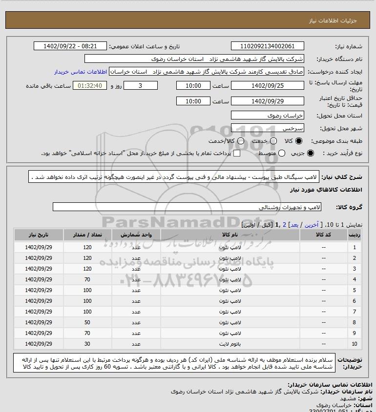 شرح کلی نیاز: لامپ سیگنال طبق پیوست - پیشنهاد مالی و فنی پیوست گردد در غیر اینصورت هیچگونه ترتیب اثری داده نخواهد شد .