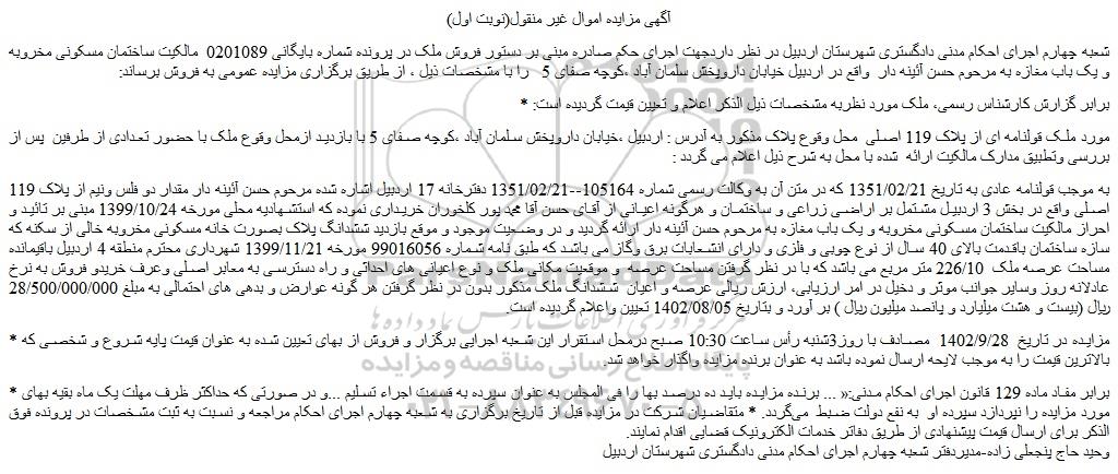 شعبه چهارم اجرای احکام مدنی دادگستری شهرستان اردبیل در نظر داردجهت اجرای حکم صادره مبنی بر دستور فروش ملک در پرونده شماره بایگانی 0201089 مالکیت ساختمان مسکونی مخروبه و یک باب مغازه به مرحوم حسن آئینه دار واقع در اردبیل خیابان داروپخش سلمان آباد ،کوچه صفای 5 را با مشخصات ذیل ، از طریق برگزاری مزایده عمومی به فروش برساند: