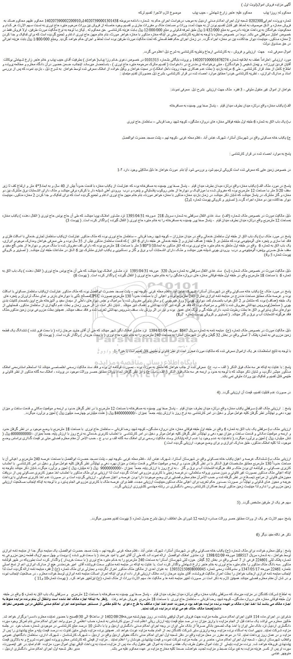 مورد ارزیابی :احتراماً عطف به ابلاغیه شماره 140207100001676274 و پرونده بایگانی بشماره 0101315 در خصوص دعوی خانم رزا پیاب( خواهان ) بطرفیت آقای حبیب پیاب و خانم هاجر زارع شهامتی بوکالت آقایان فردین نورزاده و پیمان شفیعی ( خواندگان) ، مبنی برخواسته ی مندرج در دادخواست ( تقسیم ماترک مرحومه منیره حاج نوری ) ، باستحضار میرساند اینجانب، ضمن حضور درآن دادگاه محترم و مطالعه پرونده و اطلاع کامل از مفاد قرار کارشناسی ، طی 6 مرتبه بازدید ( بعلت عدم همکاری جهت رویت داخل املاک) در معیت خواهان و وکیل خوانده از املاک معرفی شده توسط خواهان به شرح ذیل ، بازدید نموده که پس از بررسی اسناد و مدارک ابرازی، ، نظریه کارشناسی خودرا مطابق موارد احصاء شده در قرار کارشناسی، بشرح ذیل حضورتان تقدیم مینماید :