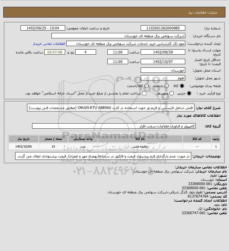 شرح کلی نیاز: فلش شامل لایسنس و فریم ور جهت استفاده در کارت CMU05-RTU ABB560 (مطابق مشخصات فنی پیوست)
