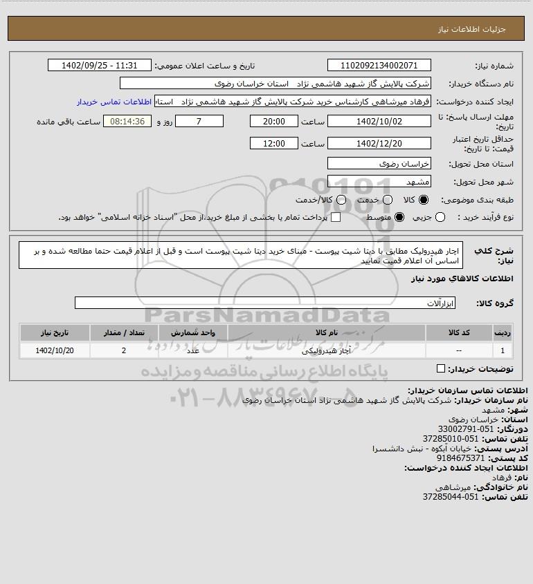 نام دستگاه خریدار:شرکت پالایش گاز شهید هاشمی نژاد استان خراسان رضوی