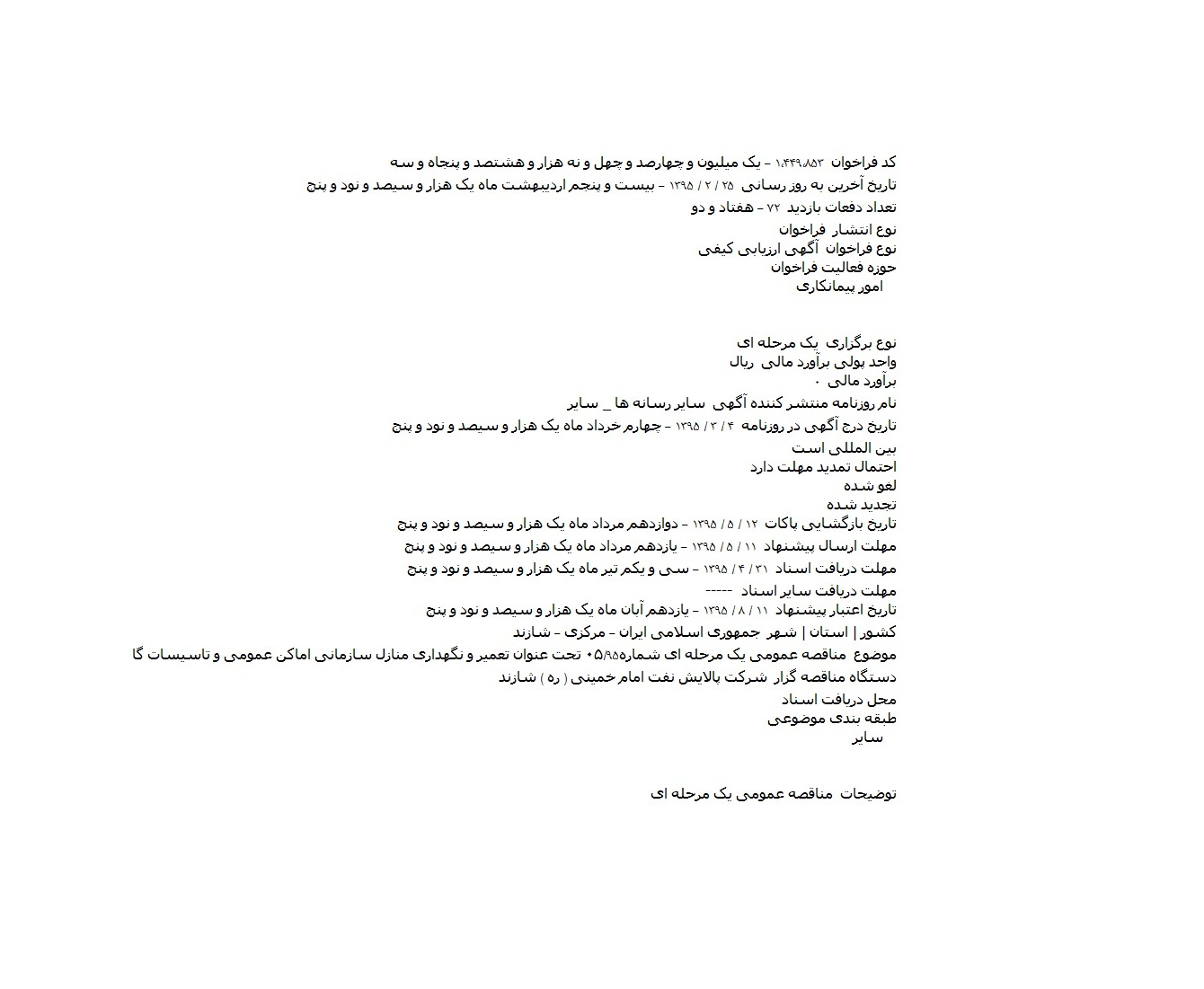 توضیحات مناقصه عمومی یک مرحله ای