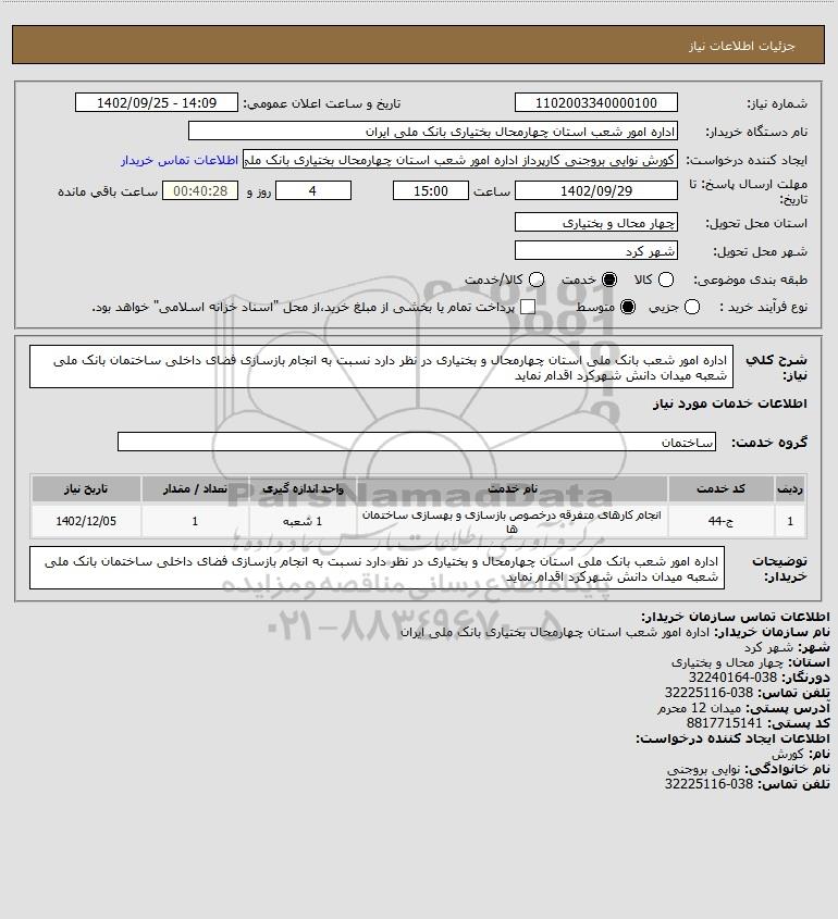 شرح کلی نیاز: اداره امور شعب بانک ملی استان چهارمحال و بختیاری در نظر دارد نسبت به انجام بازسازی فضای داخلی ساختمان بانک ملی شعبه میدان دانش شهرکرد اقدام نماید