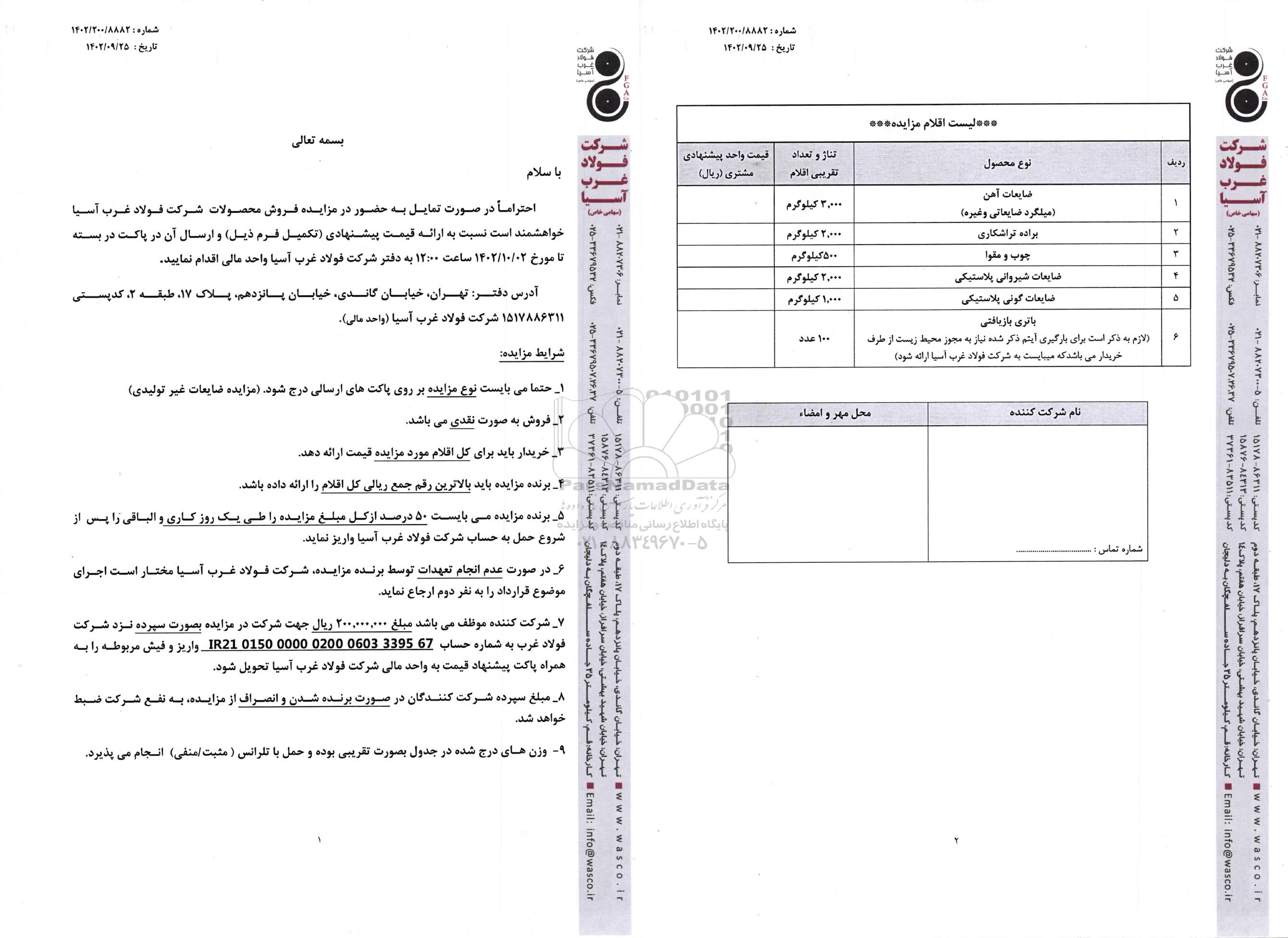 احتراما در صورت تمایل به حضور در مزایده فروش محصولات شرکت فولاد غرب آسیا خواهشمند است نسبت به ارایه قیمت پیشنهادی (تکمیل فرم ذیل) و ارسال آن در پاکت در بسته تا مورخ 1402.10.2 ساعت 12 به دفتر شرکت فولاد غرب آسیا واحد مالی اقدام نمایید.