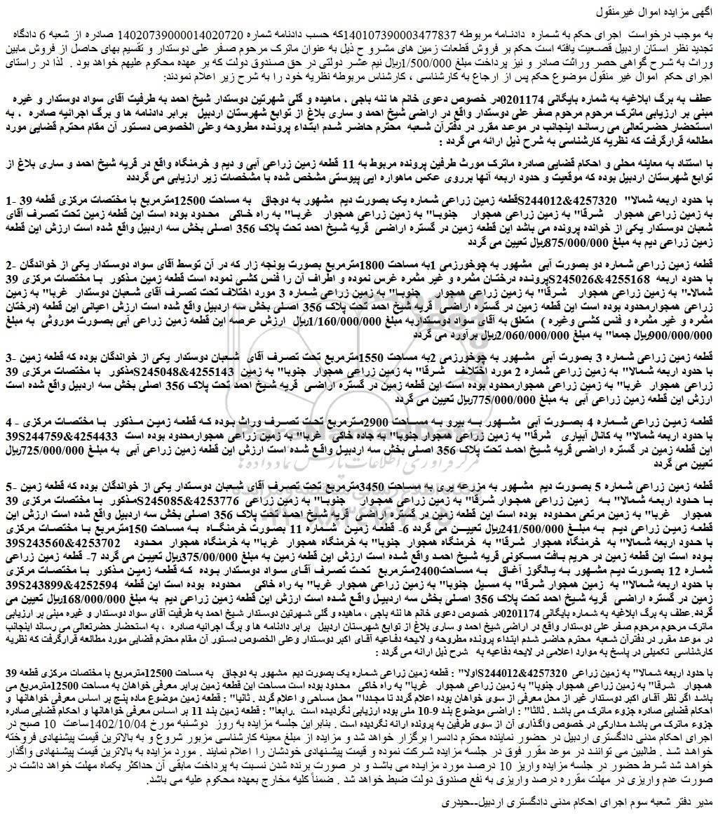 به موجب درخواست اجرای حکم به شماره دادنامه مربوطه 140107390003477837که حسب دادنامه شماره 14020739000014020720 صادره از شعبه 6 دادگاه تجدید نظر استان اردبیل قصعیت یافته است حکم بر فروش قطعات زمین های مشرو ح ذیل به عنوان ماترک مرحوم صفر علی دوستدار و تقسیم بهای حاصل از فروش مابین وراث به شرح گواهی حصر وراثت صادر و نیز پرداخت مبلغ 1/500/000ریال نیم عشر دولتی در حق صندوق دولت که بر عهده محکوم علیهم خواهد بود . لذا در راستای اجرای حکم اموال غیر منقول موضوع حکم پس از ارجاع به کارشناسی ، کارشناس مربوطه نظریه خود را به شرح زیر اعلام نمودند: