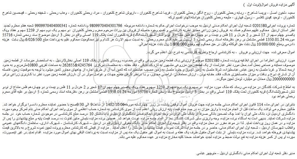شماره پرونده اجرایی0201580 شعبه اول اجرای احکام مدنی اردبیل به موجب درخواست اجرای حکم به شماره دادنامه مربوطه  9809970404301796 ودادنامه شماره 9909970404000341 شعبه هفتم محترم تجدید نظر استان اردبیل  محکوم علیهم محکوم هستند به  فروش زمین زراعی مطابق نظریه کارشناسی و تقسیم وجوه حاصله از فروش بین وراث مرحوم محرم رحمتی کلخوران  دو سهم و یک دوم سهم از 1259 سهم و هفتاد ویک یکصدو چهلم سهم از 17 شعیر و 2 خردل و 11 فلس و بیست و دو چهاردهم فلس مشاع از نودو شش شعیر(ششدانگ) قریه کلخوران تحت پلاک 119 اصلی واقع در بخش 3 اردبیل موضوع سند رسمی شماره 55716 مورخه 1350.01.24 قطعی مشتمل بر رهن دفترخانه اسناد رسمی شماره 5 اردبیل بر علیه آقای محرم رحمتی . به نسبت سهم الارث هر کدام و نیز محکومیت محکوم علیم به پرداخت مبلغ 6/026/500 ریال بابت  هزینه دادرسی ومبلغ 10/000/000 ریال بابت حق الوکاله وکیل در حق محکوم لهم ومبلغ 1/800/000 ریال بابت هزینه اجرائی