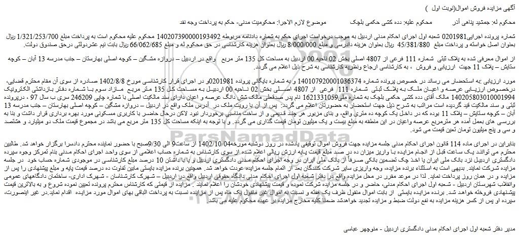 8 مزایده ملک 9810688 1404/08/15 new not special not payed اردبیل