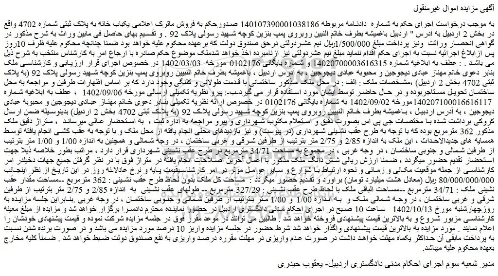 به موجب درخواست اجرای حکم به شماره دادنامه مربوطه 140107390001038186 صدورحکم به فروش ماترک اعلامی یکباب خانه به پلاک ثبتی شماره 4702 واقع در بخش 2 اردبیل به آدرس " اردبیل باغمیشه بطرف خاتم النبین روبروی پمپ بنزین کوچه شهید رسولی پلاک 92 . و تقسیم بهای حاصل فی مابین وراث به شرح مذکور در گواهی انحصار وراثت ونیز پرداخت مبلغ 1/500/000ریال نیم عشردولتی درحق صندوق دولت که برعهده محکوم علیه خواهد بود ضمنا چنانچه محکوم علیه ظرف 10روز پس ازابلاغ اجرائیه نسبت به اجرای حکم اقدام ننماید مبلغ نیم عشردولتی نیز ازنامبرده اخذ خواهد شدملک موضوع حکم صادره با ارجاع امر به کارشناس منتخب به شرح ذیل می باشد . : عطف به ابلاغیه شماره 14020700003616315 و شماره بایگانی 0102176 مورخه 1402/03/03 در خصوص اجرای قرار ارزیابی و کارشناسی ملک بنابر دعوی خانم مهناز عبادی دیجوجین و محبوبه عبادی دیجوجین ، به آدرس اردبیل ، باغمیشه بطرف خاتم النبیین روبروی پمپ بنزین کوچه شهید رسولی پلاک 92 (به پلاک ثبتی 4702 بخش 2 اردبیل) ،مشخصات ملک : الف : در محل ملک مذکور ساختمانی با قدمت طولانی و کلنگی وجود دارد که بر اساس اظهارات طرفین و مراجعه به محل ساختمان تحویل مستاجربوده و در حال حاضر توسط ایشان مورد استفاده قرار می گیرد-ب-: پیرو نظریه تکمیلی ارسالی مورخه 1402/09/06 ، عطف به ابلاغیه شماره 140207100016616117مورخه 1402/09/02 به شماره بایگانی 0102176 در خصوص ارائه نظریه تکمیلی بنابر دعوی خانم مهناز عبادی دیجوجین و محبوبه عبادی دیجوجین ، به آدرس اردبیل ، باغمیشه بطرف خاتم النبیین روبروی پمپ بنزین کوچه شهید رسولی پلاک 92 (به پلاک ثبتی 4702 بخش 2 اردبیل) بدینوسیله ضمن ارسال کروکی برداشت شده با مختصات جی پی اس بصورت دقیق و استعلام مکتوب شهرداری و پیرو مراجعه به اداره ثبت ، به استحضار عالی میرساند ، متراژ دقیق ملک مذکور 362 مترمربع بوده که با توجه به طرح عقب نشینی شهرداری (در پیوست) و نیز بازدیدهای محلی انجام یافته از محل ملک و با توجه به عقب کشی انجام یافته توسط همسایه های جدیدالاحداث ، این ملک به اندازه 2/85 و 2/75 متر بترتیب از طرفین شرقی و غربی ساختمان ، در وجه شمالی و همچنین به اندازه 1/00 و 1/00 متر بترتیب از طرفین شمالی و جنوبی ساختمان ، در وجه غربی ، در مجموع به مساحت 34/71 مترمربع در طرح عقب نشینی شهرداری قرار دارد ، مراتب بطور خلاصه ذیلا جهت استحضار تقدیم حضور میگردد ، ضمنا ارزش ریالی شش دانگ ملک مذکور با اعمال آخرین اصلاحات انجام یافته در متراژ فوق با در نظر گرفتن جمیع جهات دخیلدر امر کارشناسی از جمله موقعیت مکانی و زمانی و نحوه ارتباط با شوارع و سایر عوامل موثر در امر کارشناسیقیمت پایه و نرخ عادلانه روز در این تاریخ از نظر اینجانب 80/000/000/000 ریال (معادل هشت میلیارد تومان) برآورد و تقدیم حضور میگردد : مساحت کل ملک بدون لحاظ طرح عقب نشینی : 362 مترمربع --مساحت مقدار عقب نشینی ملک : 34/71 مترمربع --مساحت الباقی ملک با لحاظ طرح عقب نشینی : 327/29 مترمربع -- طولهای عقب نشینی به اندازه 2/85 و 2/75 متر بترتیب از طرفین شرقی و غربی ساختمان ، در وجه شمالی ملک و به اندازه 1/00 و 1/00 متر بترتیب از طرفین شمالی و جنوبی ساختمان ، در وجه غربی .بنابراین جلسه مزایده به روزچهارشنبه مورخ 1402/10/13 ساعت 10 صبح در اجرای احکام مدنی دادگستری اردبیل در حضور نماینده محترم دادسرا برگزار خواهد شد و مزایده از مبلغ معینه کارشناسی مزبور شروع و به بالاترین قیمت پیشنهادی فروخته خواهد شد . طالبین می توانند در موعد مقرر فوق در جلسه مزایده شرکت نموده و قیمت پیشنهادی خودشان را اعلام نمایند . مورد مزایده به بالاترین قیمت پیشنهادی واگذار خواهد شد شرط حضور در جلسه مزایده واریز 10 درصد مورد مزایده می باشد و در صورت برنده شدن نسبت به پرداخت مابقی آن حداکثر یکماه مهلت خواهد داشت در صورت عدم واریزی در مهلت مقرره درصد واریزی به نفع صندوق دولت ضبط خواهد شد . ضمناً کلیه مخارج بعهده محکوم علیه میباشد.