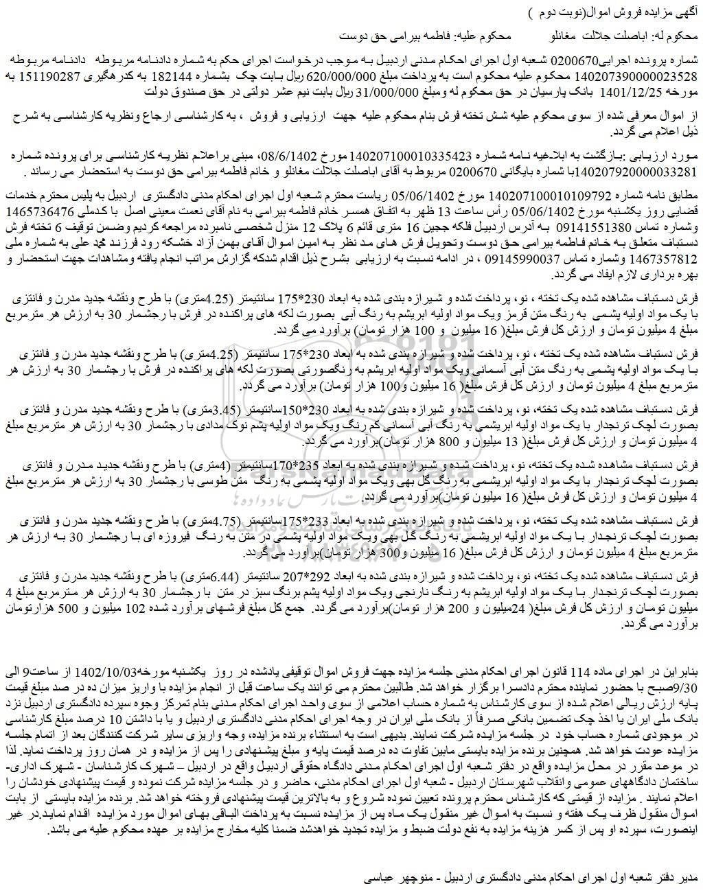 مطابق نامه شماره 140207100010109792 مورخ 05/06/1402 ریاست محترم شعبه اول اجرای احکام مدنی دادگستری اردبیل به پلیس محترم خدمات قضایی روز یکشنبه مورخ 05/06/1402 رأس ساعت 13 ظهر به اتفاق همسر خانم فاطمه بیرامی به نام آقای نعمت معینی اصل با کدملی 1465736476 وشماره تماس 09141551380 به آدرس اردبیل فلکه ججین 16 متری قائم 6 پلاک 12 منزل شخصی نامبرده مراجعه کردیم وضمن توقیف 6 تخته فرش دستباف متعلق به خانم فاطمه بیرامی حق دوست وتحویل فرش های مد نظر به امین اموال آقای بهمن آزاد خشکه رود فرزند محمد علی به شماره ملی 1467357812 وشماره تماس 09145990037 ، در ادامه نسبت به ارزیابی بشرح ذیل اقدام شدکه گزارش مراتب انجام یافته ومشاهدات جهت استحضار و بهره برداری لازم ایفاد می گردد.