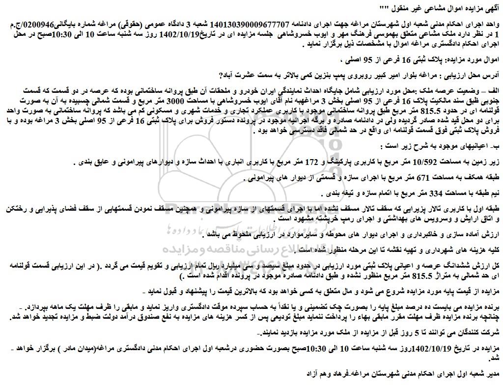 واحد اجرای احکام مدنی شعبه اول شهرستان مراغه جهت اجرای دادنامه 140130390009677707 شعبه 3 دادگاه عمومی (حقوقی) مراغه شماره بایگانی0200946/ج.م 1 در نظر دارد ملک مشاعی متعلق بهموسی فرهنگ مهر و ایوب خسروشاهی جلسه مزایده ای در تاریخ1402/10/19 روز سه شنبه ساعت 10 الی 10:30صبح در محل اجرای احکام دادگستری مراغه اموال با مشخصات ذیل برگزار نماید .