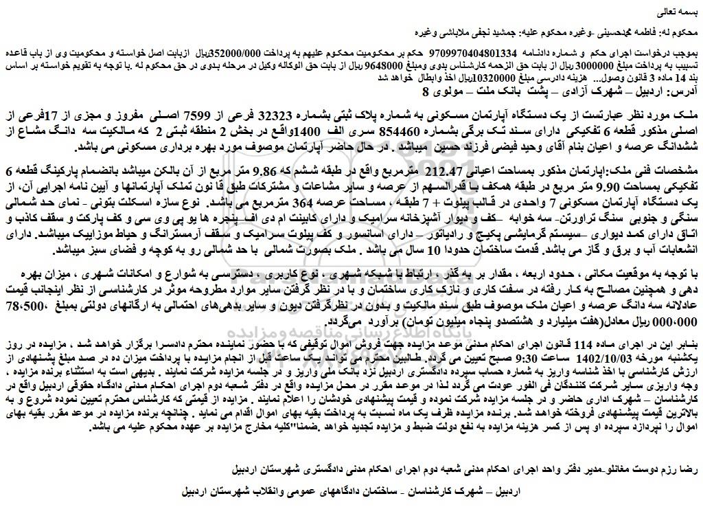 8 مزایده ملک 9810688 1404/08/15 new not special not payed اردبیل