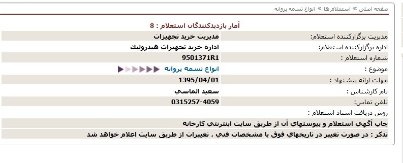 اداره برگزارکننده استعلام: اداره خرید تجهیزات هیدرولیک