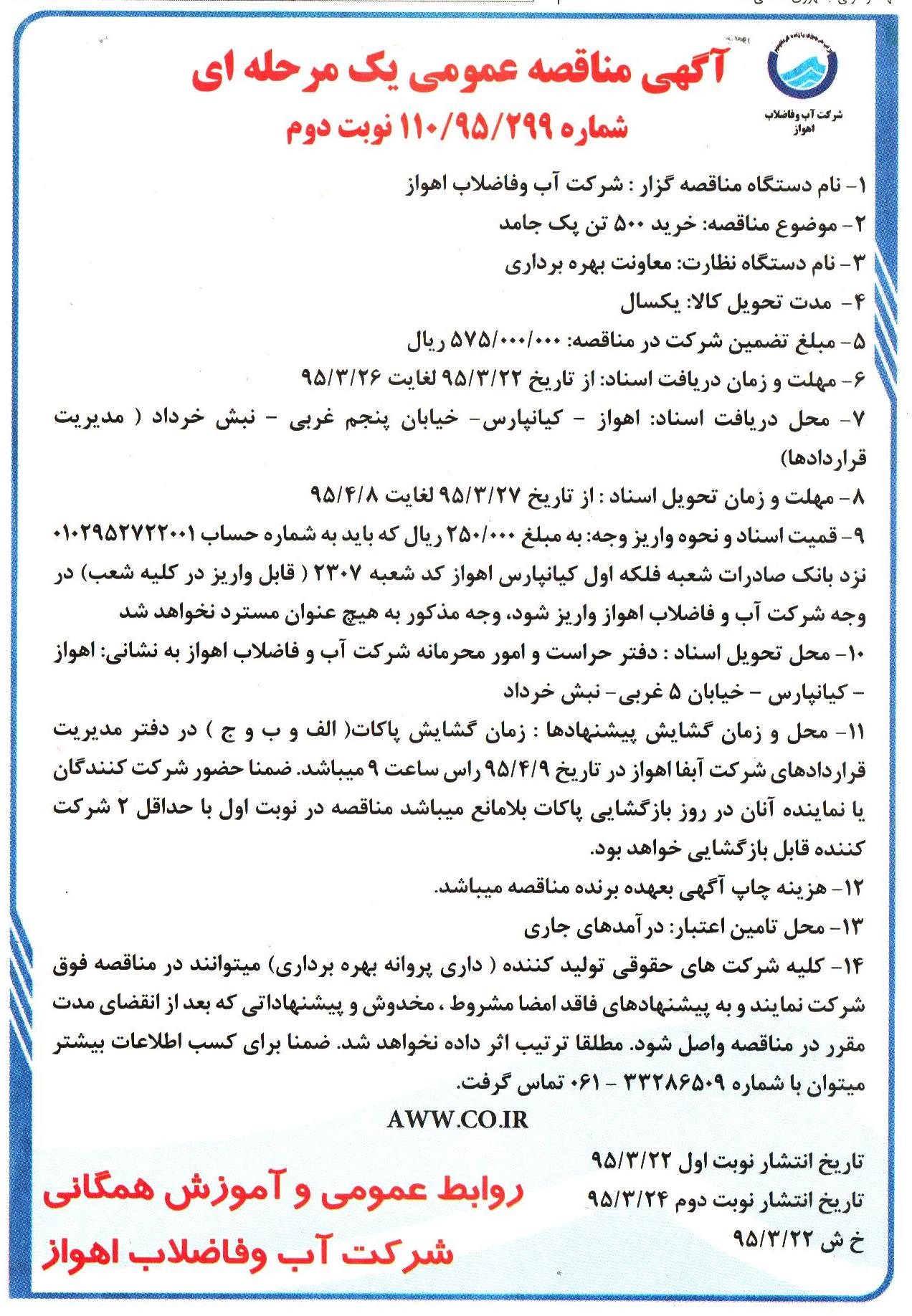 11-محل و زمان گشایش پیشنهادها: زمان گشایش پاکات (الف و ب و ج) در دفتر مدیریت قراردادهای شرکت آبفای اهواز در تاریخ 95.4.9 رأس ساعت 9 صبح می باشد. ضمناً حضور شرکت کنندگان یا نماینده آنان در روز بازگشایی پاکات بلامانع می باشد. مناقصه در نوبت اول با حداقل 2 شرکت کننده قابل بازگشایی خواهد بود.