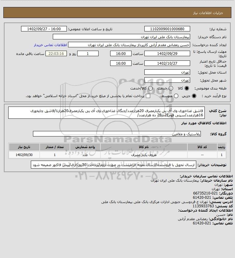 نام دستگاه خریدار:بیمارستان بانک ملی ایران تهران