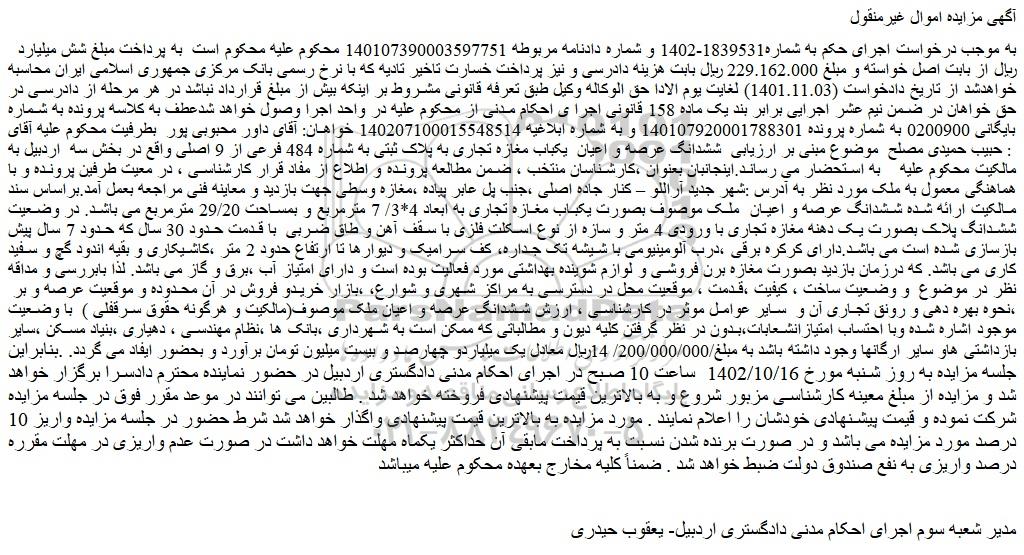به موجب درخواست اجرای حکم به شماره1839531-1402 و شماره دادنامه مربوطه 140107390003597751 محکوم علیه محکوم است به پرداخت مبلغ شش میلیارد ریال از بابت اصل خواسته و مبلغ 229.162.000 ریال بابت هزینه دادرسی و نیز پرداخت خسارت تاخیر تادیه که با نرخ رسمی بانک مرکزی جمهوری اسلامی ایران محاسبه خواهدشد از تاریخ دادخواست (1401.11.03) لغایت یوم الادا حق الوکاله وکیل طبق تعرفه قانونی مشروط بر اینکه بیش از مبلغ قرارداد نباشد در هر مرحله از دادرسی در حق خواهان در ضمن نیم عشر اجرایی برابر بند یک ماده 158 قانونی اجرا ی احکام مدنی از محکوم علیه در واحد اجرا وصول خواهد شدعطف به کلاسه پرونده به شماره بایگانی 0200900 به شماره پرونده 140107920001788301 و به شماره ابلاغیه 140207100015548514 خواهان: آقای داور محبوبی پور بطرفیت محکوم علیه آقای : حبیب حمیدی مصلح موضوع مبنی بر ارزیابی ششدانگ عرصه و اعیان یکباب مغازه تجاری به پلاک ثبتی به شماره 484 فرعی از 9 اصلی واقع در بخش سه اردبیل به مالکیت محکوم علیه به استحضار می رساند.اینجانبان بعنوان ،کارشناسان منتخب ، ضمن مطالعه پرونده و اطلاع از مفاد قرار کارشناسی ، در معیت طرفین پرونده و با هماهنگی معمول به ملک مورد نظر به آدرس :شهر جدید آراللو – کنار جاده اصلی ،جنب پل عابر پیاده ،مغازه وسطی جهت بازدید و معاینه فنی مراجعه بعمل آمد.براساس سند مالکیت ارائه شده ششدانگ عرصه و اعیان ملک موصوف بصورت یکباب مغازه تجاری به ابعاد 4*3/ 7 مترمربع و بمساحت 29/20 مترمربع می باشد. در وضعیت ششدانگ پلاک بصورت یک دهنه مغازه تجاری با ورودی 4 متر و سازه از نوع اسکلت فلزی با سقف آهن و طاق ضربی با قدمت حدود 30 سال که حدود 7 سال پیش بازسازی شده است می باشد.دارای کرکره برقی ،درب آلومینیومی با شیشه تک جداره، کف سرامیک و دیوارها تا ارتفاع حدود 2 متر ،کاشیکاری و بقیه اندود گچ و سفید کاری می باشد. که درزمان بازدید بصورت مغازه برن فروشی و لوازم شوینده بهداشتی مورد فعالیت بوده است و دارای امتیاز آب ،برق و گاز می باشد. لذا بابررسی و مداقه نظر در موضوع و وضعیت ساخت ، کیفیت ،قدمت ، موقعیت محل در دسترسی به مراکز شهری و شوارع، ،بازار خریدو فروش در آن محدوده و موقعیت عرصه و بر ،نحوه بهره دهی و رونق تجاری آن و سایر عوامل موثر در کارشناسی ، ارزش ششدانگ عرصه و اعیان ملک موصوف(مالکیت و هرگونه حقوق سرقفلی ) با وضعیت موجود اشاره شده وبا احتساب امتیازانشعابات،بدون در نظر گرفتن کلیه دیون و مطالباتی که ممکن است به شهرداری ،بانک ها ،نظام مهندسی ، دهیاری ،بنیاد مسکن ،سایر بازداشتی هاو سایر ارگانها وجود داشته باشد به مبلغ/200/000/000/ 14ریال معادل یک میلیاردو چهارصد و بیست میلیون تومان برآورد و بحضور ایفاد می گردد. .بنابراین جلسه مزایده به روز شنبه مورخ 1402/10/16 ساعت 10 صبح در اجرای احکام مدنی دادگستری اردبیل در حضور نماینده محترم دادسرا برگزار خواهد شد و مزایده از مبلغ معینه کارشناسی مزبور شروع و به بالاترین قیمت پیشنهادی فروخته خواهد شد . طالبین می توانند در موعد مقرر فوق در جلسه مزایده شرکت نموده و قیمت پیشنهادی خودشان را اعلام نمایند . مورد مزایده به بالاترین قیمت پیشنهادی واگذار خواهد شد شرط حضور در جلسه مزایده واریز 10 درصد مورد مزایده می باشد و در صورت برنده شدن نسبت به پرداخت مابقی آن حداکثر یکماه مهلت خواهد داشت در صورت عدم واریزی در مهلت مقرره درصد واریزی به نفع صندوق دولت ضبط خواهد شد . ضمناً کلیه مخارج بعهده محکوم علیه میباشد