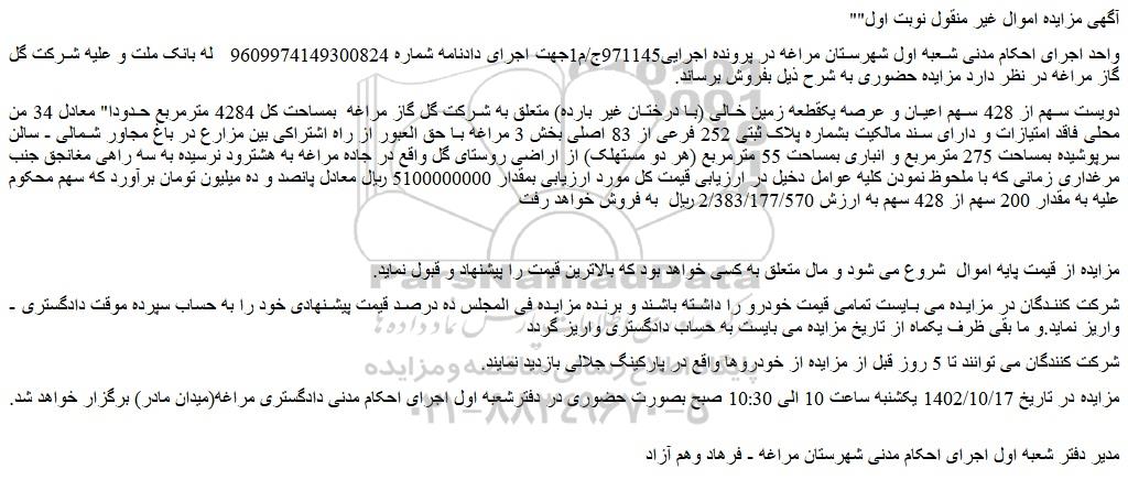 دویست سهم از 428 سهم اعیان و عرصه یکقطعه زمین خالی (با درختان غیر بارده) متعلق به شرکت گل گاز مراغه بمساحت کل 4284 مترمربع حدودا" معادل 34 من محلی فاقد امتیازات و دارای سند مالکیت بشماره پلاک ثبتی 252 فرعی از 83 اصلی بخش 3 مراغه با حق العبور از راه اشتراکی بین مزارع در باغ مجاور شمالی - سالن سرپوشیده بمساحت 275 مترمربع و انباری بمساحت 55 مترمربع (هر دو مستهلک) از اراضی روستای گل واقع در جاده مراغه به هشترود نرسیده به سه راهی مغانجق جنب مرغداری زمانی که با ملحوظ نمودن کلیه عوامل دخیل در ارزیابی قیمت کل مورد ارزیابی بمقدار 5100000000 ریال معادل پانصد و ده میلیون تومان برآورد که سهم محکوم علیه به مقدار 200 سهم از 428 سهم به ارزش 2/383/177/570 ریال به فروش خواهد رفت