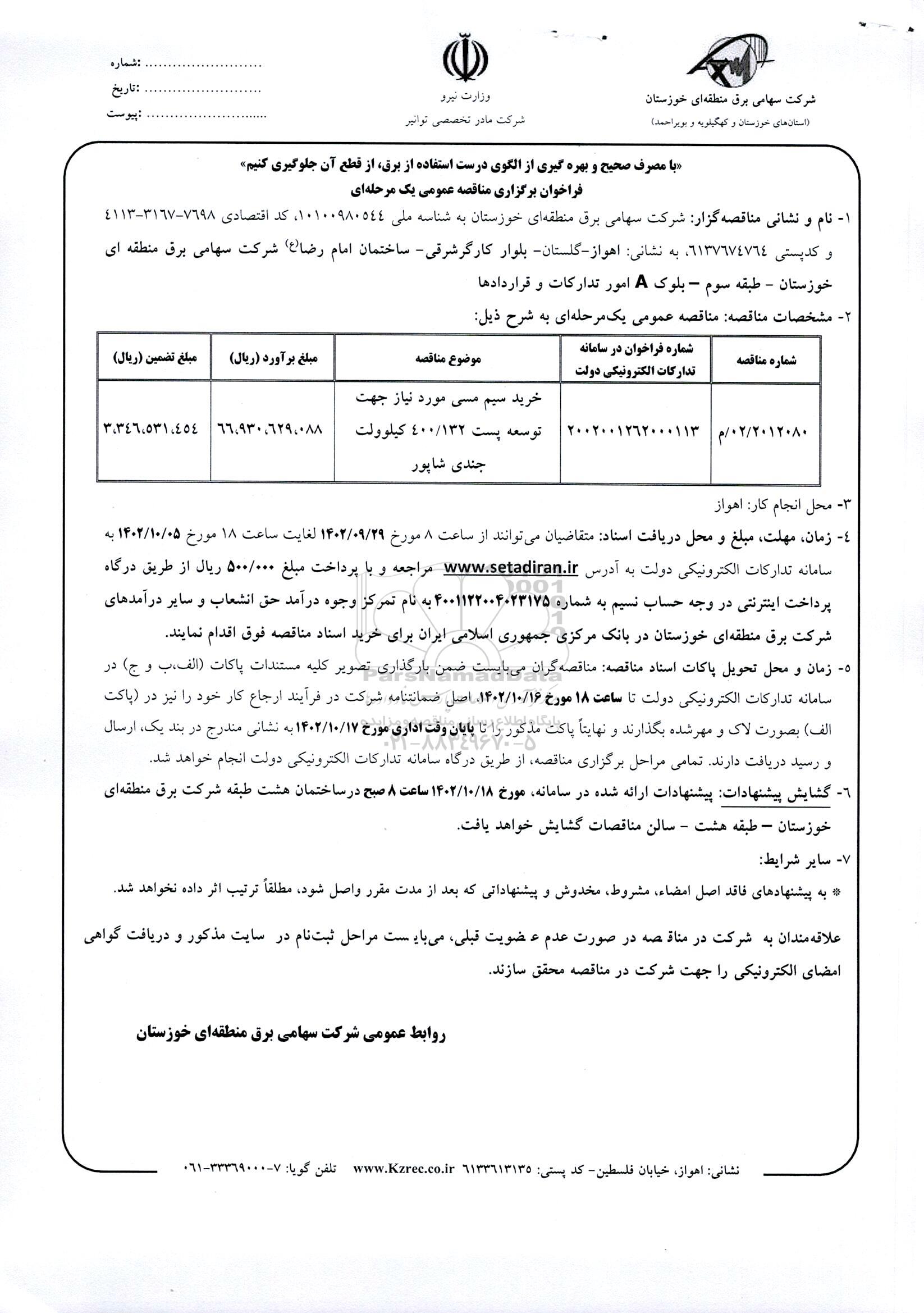 | 02/2012080 / م | 2002001262000113 | خرید سیم مسی مورد نیاز جهت توسعه پست 400.132 کیلوولت جندی شاپور | 66.930.629.088 | 3.346.531.454 |