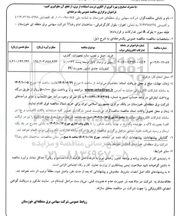 | 02/2012082 / م | 2002001262000112 | خرید،حمل و نصب سازه تجهیزات، گنتری، سینی و نردبان کابل توسعه پست 400/132 کیلوولت جندی شاپور به صورت PC | 164.203.845.923 | 8.210.192.296 |