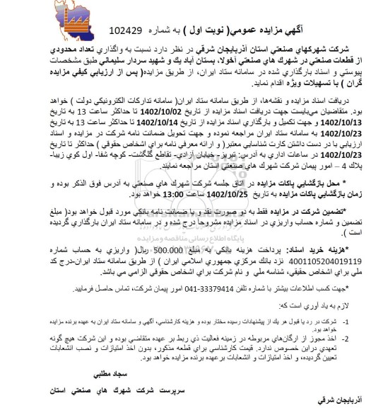 شرکت شهرکهای صنعتی استان آذربایجان شرقی در نظر دارد نسبت به واگذاری تعداد محدودی از قطعات صنعتی در شهرک های صنعتی آخولا، بستان آباد یک و شهید سردار سلیمانی طبق مشخصات پیوستی و اسناد بارگذاری شده در سامانه ستاد ایران از طریق مزایده (پس از ارزیابی کیفی مزایده گران) با تسهیلات ویژه اقدام نماید.