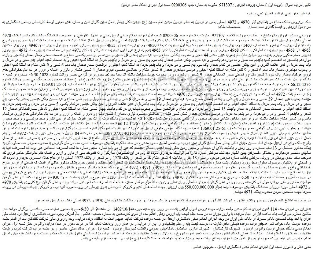 مزایده فروش ملک مشاع در پلاکهای ثبتی 4970 و 4972 اصلی, مزایده فروش ملک مشاع در پلاکهای ثبتی 4970 و 4972 اصلی