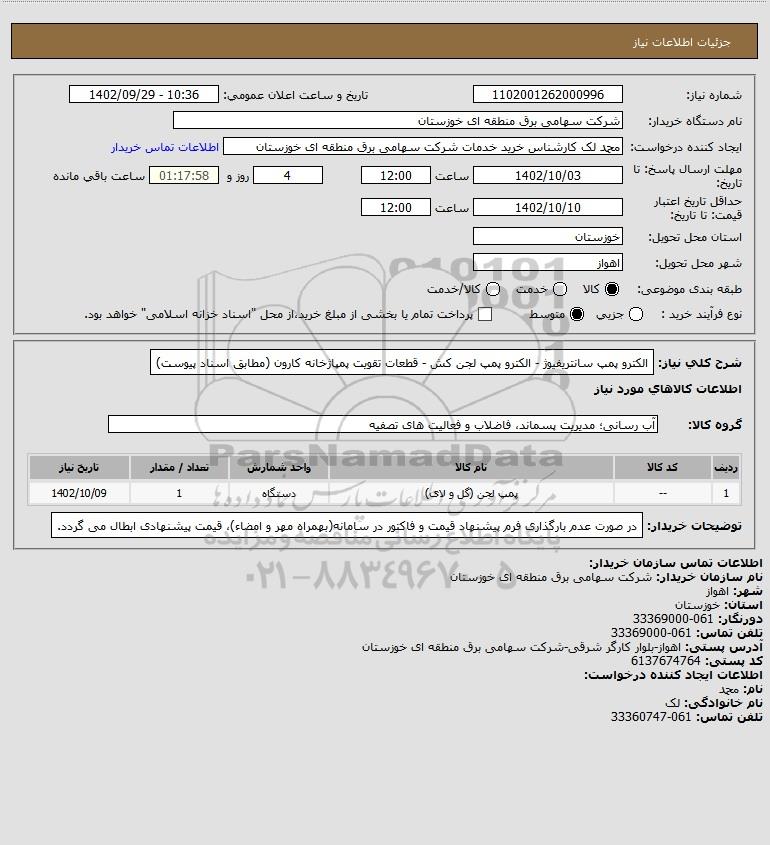 شرح کلی نیاز: الکترو پمپ سانتریفیوژ - الکترو پمپ لجن کش - قطعات تقویت پمپاژخانه کارون (مطابق اسناد پیوست)