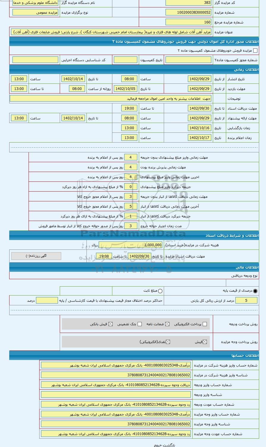 کد مزایده گزار383نام دستگاه مزایده گزاردانشگاه علوم پزشکی و خدمات بهداشتی درمانی بوشهر