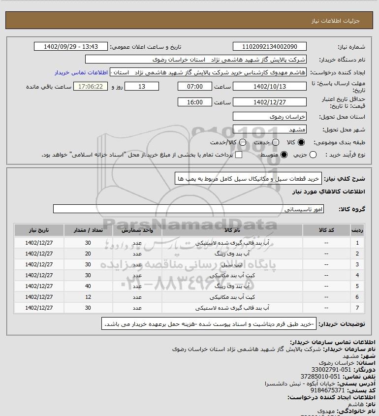 | 4 | -- | کیت آب بند مکانیکی | عدد | 30 | 1402/12/27 |