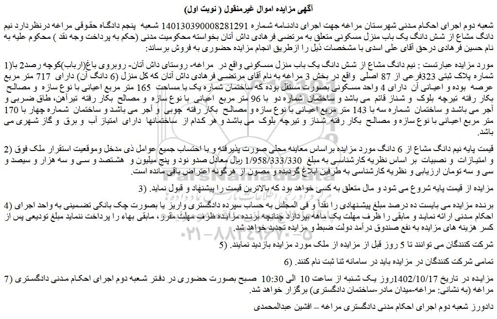 شعبه دوم اجرای احکام مدنی شهرستان مراغه جهت اجرای دادنامه شماره 140130390008281291 شعبه پنجم دادگاه حقوقی مراغه درنظردارد نیم دانگ مشاع از شش دانگ یک باب منزل مسکونی متعلق به مرتضی فرهادی داش آتان بخواسته محکومیت مدنی (حکم به پرداخت وجه نقد ) محکوم علیه به نام حسین فرهادی درحق آقای علی اسدی با مشخصات ذیل را ازطریق انجام مزایده حضوری به فروش برساند: