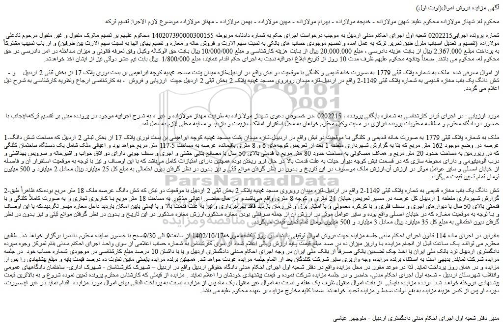 شماره پرونده اجرایی0202215 شعبه اول اجرای احکام مدنی اردبیل به موجب درخواست اجرای حکم به شماره دادنامه مربوطه 140207390000300155 محکوم علیهم بر تقسیم ماترک منقول و غیر منقول مرحوم نادعلی مولازاده (تقسیم و تعدیل اسباب منزل طبق تحریر ترکه به عمل آمده و تقسیم موجودی حساب های بانکی به نسبت سهم الارث و فروش خانه و مغازه و تقسیم بهای آنها به نسبت سهم الارث بین طرفین) و از باب تسبیب مشترکاً به پرداخت مبلغ 2.367.000 ریال از بابت هزینه دادرسی ، مبلغ 20.000.000 ریال از بابت هزینه کارشناسی و مبلغ 10/000/000 ریال بابت حق الوکاله وکیل وفق تعرفه قانونی و میزان مداخله در امر دادرسی در حق محکوم له، محکوم می باشند. ضمناً چنانچه محکوم علیهم ظرف مدت 10 روز از تاریخ ابلاغ اجرائیه نسبت به اجرای حکم اقدام ننمایند؛ مبلغ 1/800/000 ریال بابت نیم عشر دولتی نیز از ایشان اخذ خواهدشد.