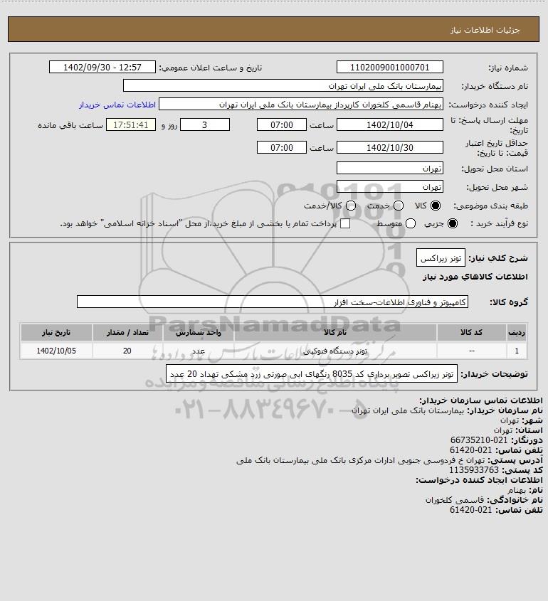 نام دستگاه خریدار:بیمارستان بانک ملی ایران تهران