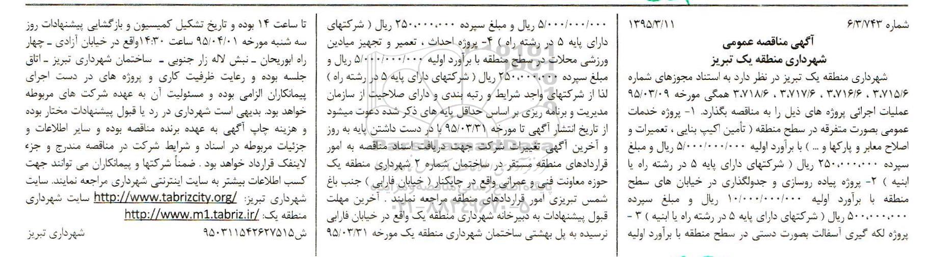 شهرداری منطقه یک تبریز در نظر دارد عملیات اجرائی پروژه های ذیل را به مناقصه بگذارد. 1. پروژه خدمات عمومی بصورت متفرقه در سطح منطقه (تأمین اکیپ بنایی، تعمیرات و اصلاح معابر و پارکها و ...) با برآورد اولیه 5.000.000.000 ریال و مبلغ سپرده 250.000.000 ریال (شرکتهای دارای پایه 5 در رشته راه یا ابنیه) 2. پروژه پیاده روسازی و جدولگذاری در خیابانهای سطح منطقه با برآورد اولیه 10.000.000.000 ریال و مبلغ سپرده 500.000.000 ریال (شرکتهای دارای پایه 5 در رشته راه یا ابنیه) 3. پروژه لکه گیری آسفالت بصورت دستی در سطح منطقه با برآورد اولیه 5.000.000.000 ریال و مبلغ سپرده 250.000.000 ریال (شرکتهای دارای پایه 5 در رشته راه) 4. پروژه احداث، تعمیر و تجهیز میادین ورزشی محلات در سطح م نطقه با برآورد اولیه 5.000.000.000 ریال و مبلغ سپرده 250.000.000 ریال 0شرکتهای دارای پایه 5 در رشته راه) لذا از شرکتهای واجد شرایط و رتبه بندی و دارای صلاحیت از سازمان مدیریت و برنامه ریزی براساس حداقل پایه های ذکر شده دعوت میشود از تاریخ انتشار آگهی تا مورخ 95.03.31 با در دست داشتن پایه به روز و آخرین آگهی تغییرات شرکت جهت دریافت اسناد مناقصه به امور قراردادهای منطقه مستقر در ساختمان شماره 2 شهرداری منطقه یک حوزه معاونت فنی و عمرانی واقع در چایکنار (خیابان فارابی) جنب باغ شمس تبریزی امور قراردادهای منطقه مراجعه نمایند. آخرین مهلت قبول پیشنهادات به دبیرخانه شهرداری منطقه یک واقع در خیابان فارابی نرسیده به پل بهشتی ساختمان شهرداری منطقه یک مورخ 95.03.31 تا ساعت 14 بوده و تاریخ تشکیل کمسیون و بازگشایی پیشنهادات روز سه شنبه مورخ 95.04.01 ساعت 14:30 واقع در خیابان ازادی، چهار راه ابوریحان، نبش لاله زار جنوبی، ساختمان شهرداری تبریز، اتاق جلسه بوده و رعایت ظرفیت کاری و پروژه های در دست اجرای پیمانکاران الزامی بوده و مسئولیت آن به عهده شرکت های مربوطه خواهد بود. بدیهی است شهرداری در رد یا قبول پیشنهادات مختار بوده و هزینه چاپ آگهی به عهده برنده مناقصه بوده و سایر اطلاعات و جزئیات مربوطه در ا سناد و شرایط شرکت در مناقصه مندرج و جزء لاینفک قرارداد خواهد بود. ضمناً شرکتها و پیمانکاران می توانند جهت کسب اطلاعات بیشتر به سایت اینترنتی شهرداری مراجعه نمایند. سایت شهرداری تبریز http://www.tabrizcity.org سایت شهرداری منطقه یک http://www.m1.tabriz.ir