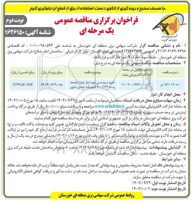 | 02/2012080 / م | 2002001262000113 | خرید سیم مسی مورد نیاز جهت توسعه پست 400.132 کیلوولت جندی شاپور | 66.930.629.088 | 3.346.531.454 |