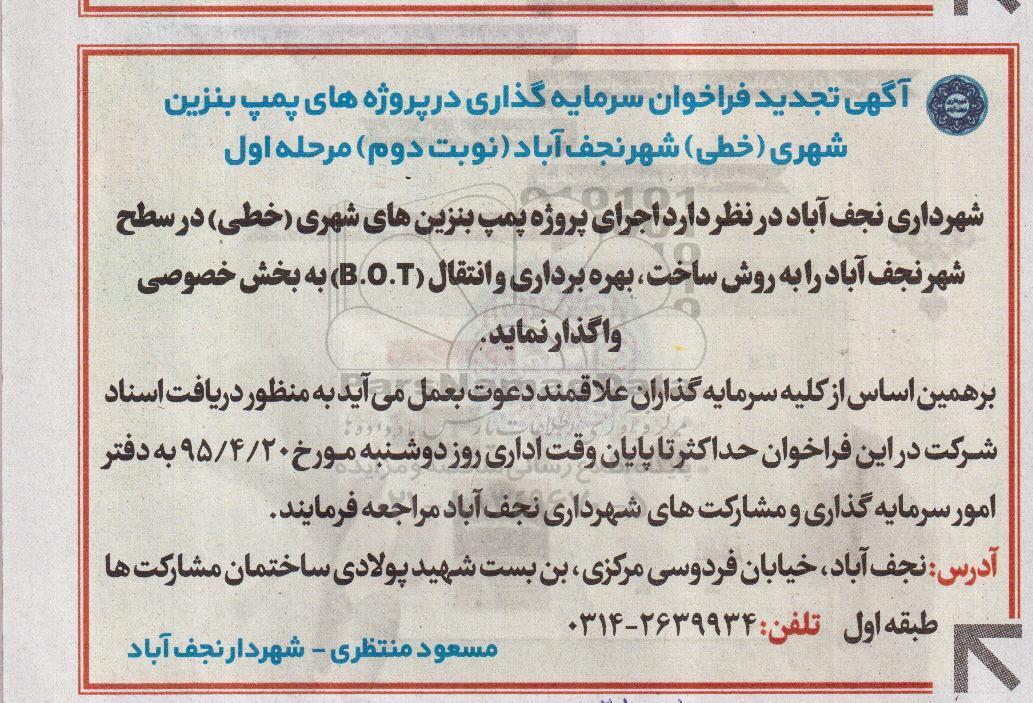 برهمین اساس از کلیه سرمایه گذاران علاقمند دعوت به عمل می آید به منظور دریافت اسناد شرکت در این فراخوان حداکثر تا پایان وقت اداری روز دوشنبه مورخ 95.04.20 به دفتر امور سرمایه گذاری و مشارکت های شهرداری نجف آباد مراجعه فرمایند.