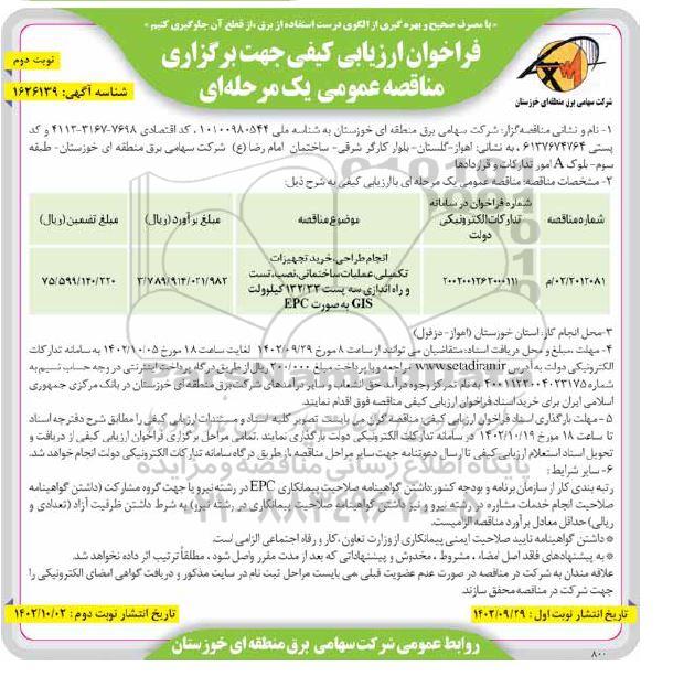 | 2012081 / 02 / م | 2002001262000111 | انجام طراحی ، خرید تجهیزات تکمیلی ، عملیات ساختمانی، نصب، تست و راه اندازی سه پست 132.33 کیلوولت GIS به صورت EPC | 3.789.914.021.982 | 75.599.140.220 |