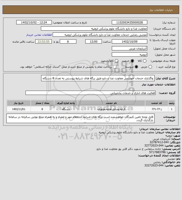 شرح کلی نیاز: واگذاری خدمات خودرویی معاونت غذا و دارو طبق برگه های شرایط پیوستی به تعداد 8 دستگاه