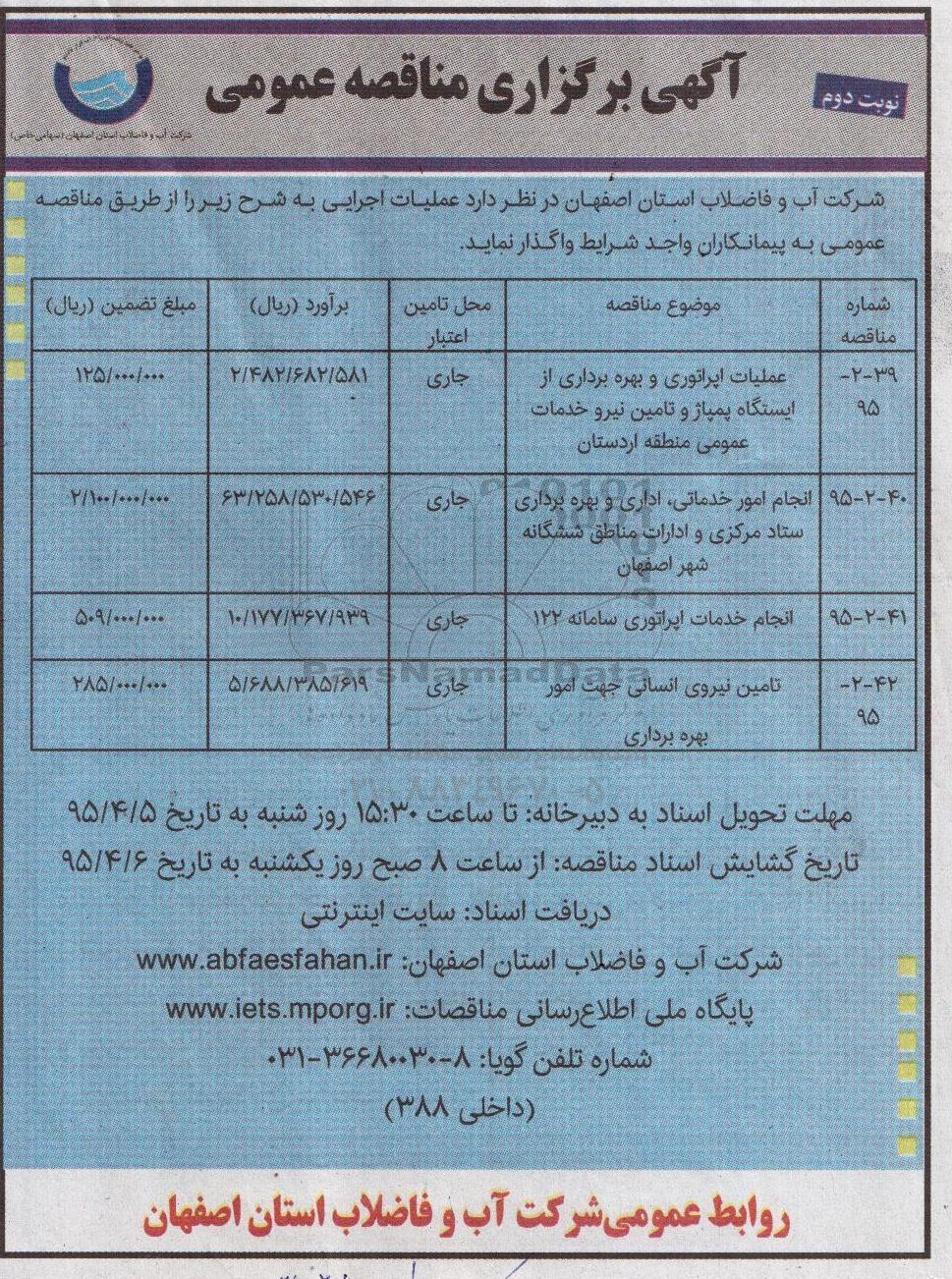 شرکت آب و فاضلاب استان اصفهان در نظر دارد عملیات اجرایی به شرح زیر را از طریق مناقصه عمومی به پیمانکاران واجد شرایط واگذار نماید