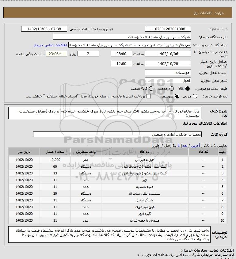 | 1 | -- | کابل مخابراتی | متر | 10,000 | 1402/10/20 |