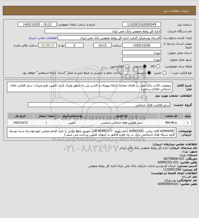 شرح کلی نیاز: پرومونت اکانت بانک ملی در فضای مجازی (ارائه پروپزال و اکشن پلن به منظور وایرال کردن کمپین طرح میراث، سایر فعالیت های خدماتی اطلاع رسانی)