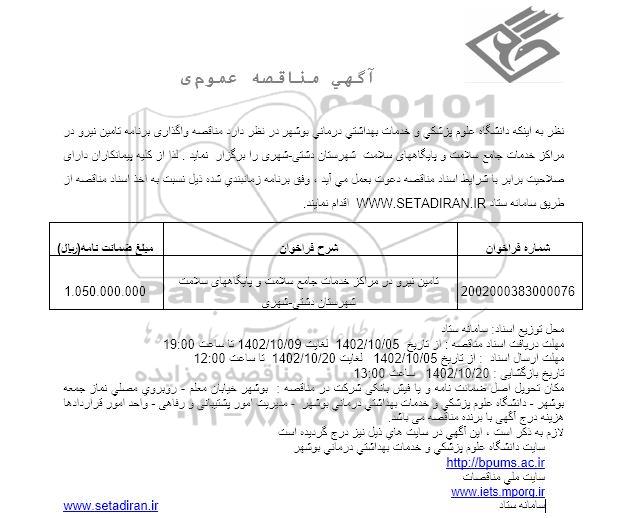 نظر به اینكه دانشگاه علوم پزشكی و خدمات بهداشتی درمانی بوشهر در نظر دارد مناقصه واگذاری برنامه تامین نیرو در مراکز خدمات جامع سلامت و پایگاه های سلامت شهرستان دشتی -شهری را برگزار نماید.  لذا از کلیه پیمانکاران دارای صلاحیت برابر با شرایط اسناد مناقصه دعوت به عمل می آید وفق برنامه زمان بندی شده ذیل نسبت به اخذ اسناد مناقصه از طریق سامانه ستاد ایران اقدام نمایند.
