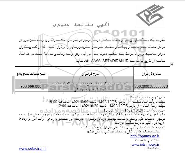 | 2002000383000078 | تامین نیرو در مراکز خدمات جامع سلامت و پایگاه های سلامت شهرستان عسلویه- روستایی | 903.000.000 |