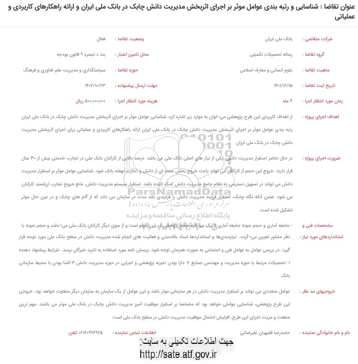 عنوان تقاضا : شناسایی و رتبه بندی عوامل موثر بر اجرای اثربخش مدیریت دانش چابک در بانک ملی ایران و ارائه راهکارهای کاربردی و عملیاتی