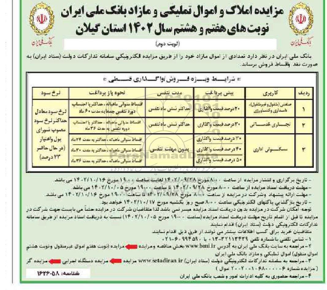 مزایده املاک و اموال تملیکی و مازاد بانک ملی ایران نوبت های هفتم و هشتم سال 1402 استان گیلان