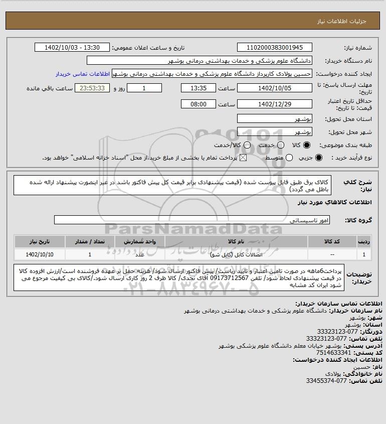 | 1 | -- | اتصالات کابل (کابل شو) | عدد | 1 | 1402/10/10 |