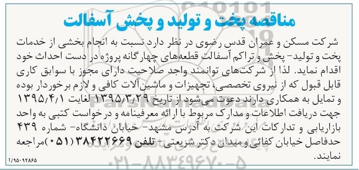 شرکت مسکن و عمران قدس رضوی در نظر دارد نسبت به انجام بخشی از خدمات پخت و تولید - پخش و تراکم آسفالت قطعه های چهارگانه پروژه در دست احداث خود اقدام نماید. لذا از شرکتهای توانمند واجد صلاحیت دارای مجوز با سوابق کاری قابل قبول که از نیروی تخصصی تجهیزات و ماشین آلات کافی و لازم برخوردار بوده و تمایل به همکاری دارند دعوت می شود از تاریخ 95.3.29 لغایت 95.4.1 حهت دریافت اطلاعات و مدارک مربوط با ارائه معرفینامه و درخواست کتبی به واحد بازاریابی و تدارکات این شرکت به آدرس مشهد خیابان دانشگاه شماره 439 حد فاصل خیابان کفایی و میدان دکتر شریعتی تلفن 38422669-051 مراجعه نمایند
