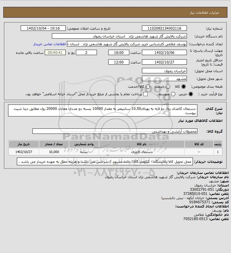 شرح کلی نیاز: دستمال کاغذی رول دو لایه به پهنای10.50 سانتیمتر به مقدار 10000 بسته دو عددی معادل 20000 رول مطابق دیتا شیت پیوست