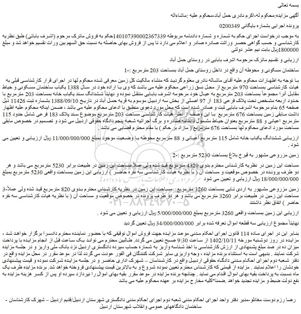 به موجب درخواست اجرای حکم به شماره و شماره دادنامه مربوطه 140107390002367339حکم به فروش ماترک مرحوم (اشرف بابائی) طبق نظریه کارشناسی و حسب گواهی حصر وراثت صادره صادر و اعلام می دارد تا پس از فروش بهای حاصله به نسبت حق السهم بین وراث تقسیم خواهد شد و مبلغ 1800000ریال بابت نیم عشر دولتی